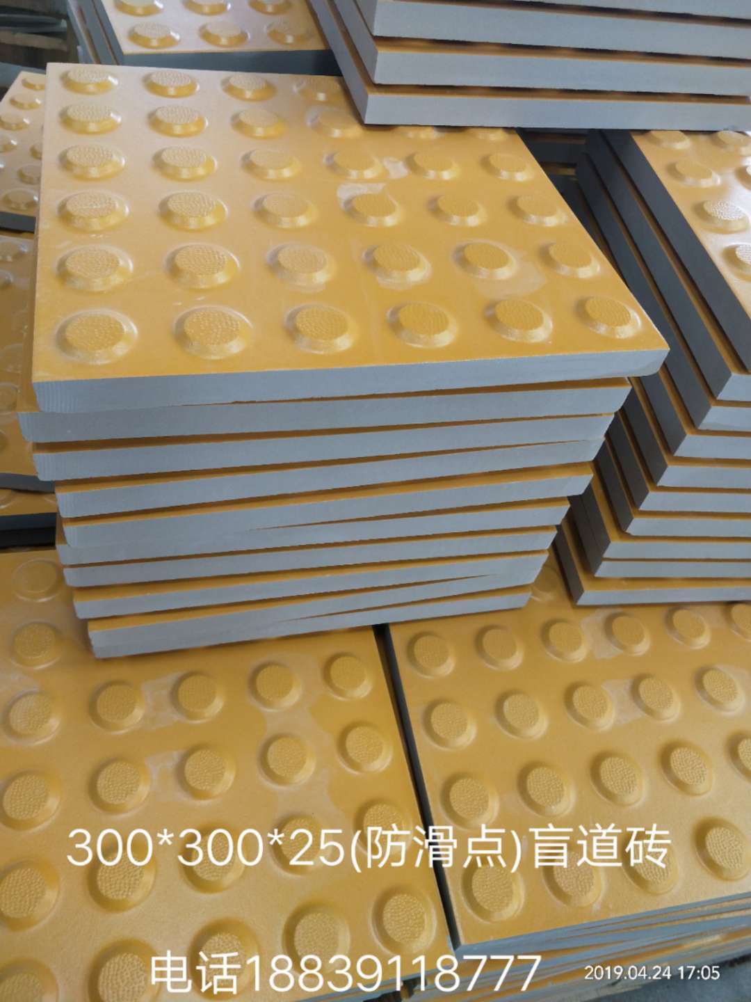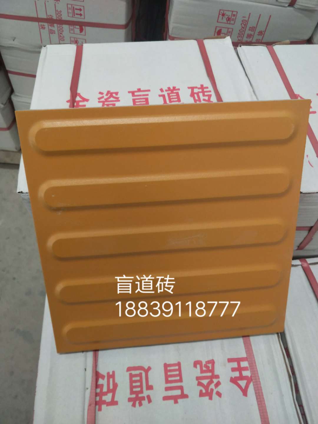 二、陶瓷止步盲道磚,300*300*25(帶防滑點),【全瓷盲道磚特點】:.色彩鮮亮:高溫燒結、自然成色、故其色彩更顯純凈天然、高雅華貴。.美觀大方:簡潔大方、觸覺明顯、磚體表面如玉、不褪色。.抗風化:工藝配方獨特,內(nèi)外品質(zhì)一致,久經(jīng)風吹雨曬,雨雪露凍,而光彩依然。.抗折抗壓:產(chǎn)品厚度達到20mm-25mm??拐蹚姸?、抗壓強度均大于花崗巖。.耐磨性:高壓成型、吸水率小、體質(zhì)密度大、耐磨耐用。