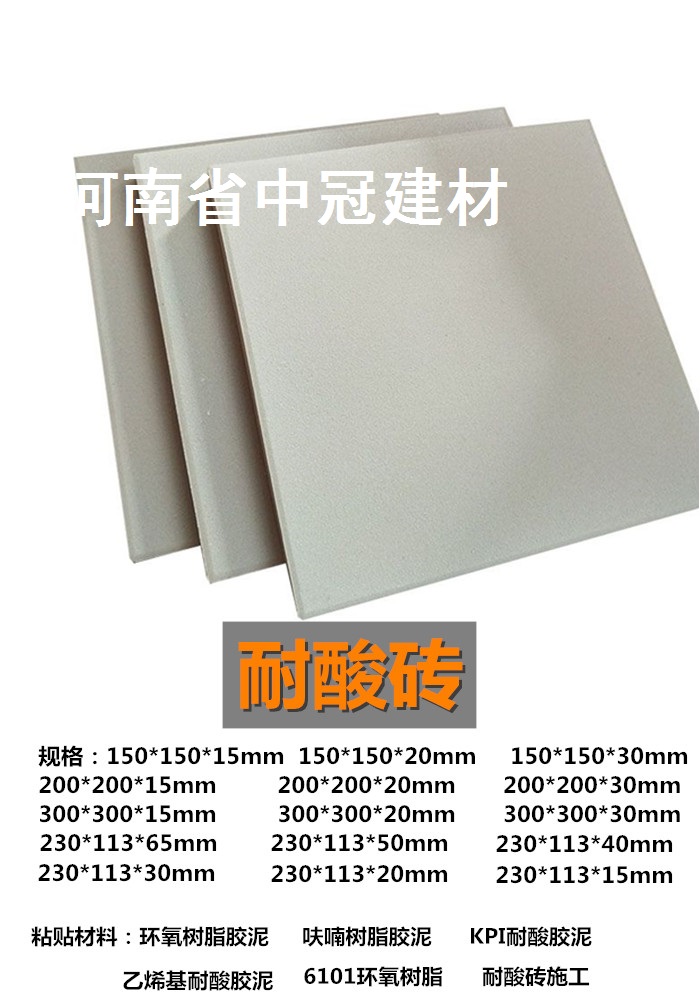 防腐耐酸磚哪家強?河南中冠建材有限公司有耐酸磚、耐酸瓷板、耐酸地磚,還有防腐膠泥KPI,YJ呋喃樹脂膠泥、環(huán)氧膠泥等,具體規(guī)格看看下面的圖哦!